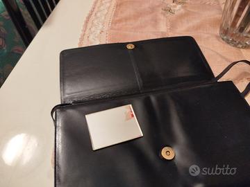 borsa di vera pelle comperata in occasione importante e usata qualche volta di colore nero marca "Pelletteria ALBANO" . All'interno foderata in pelle e un taschino con cerniera con tracolla in pelle che si può togliere, chiusura con un bel fermaglio dorato. Misura cm, 32 di lunghezza. In regalo uno specchietto da borsa con cartellino di colore rosso bordeax brillantinato, non quello della foto che pero' è quello originale.