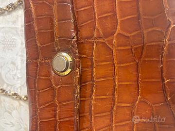 Elegante borsa vintage in vera pelle con stampa coccodrillo color cuoio.
