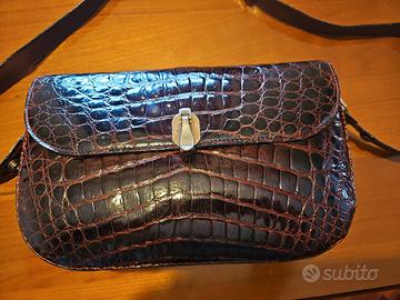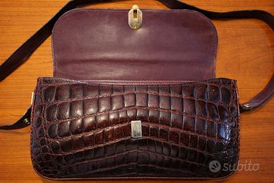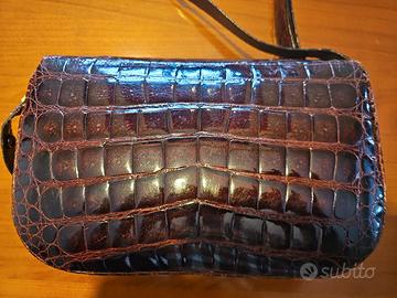 Bellissima borsa vintage in autentica pelle di coccodrillo, caratterizzata da un pregiato taglio centrale della pelle con disegno delle squame armonioso e di grande impatto estetico. Modello compatto e raffinato, facilmente abbinabile sia ad outfit eleganti che casual chic. Colore marrone scuro con riflessi caldi, molto attuale e ricercato. Condizioni: Esterno in ottime condizioni, pelle sana e lucida Normali lievi segni del tempo, tipici del vintage Struttura ben mantenuta Caratteristiche: Vera pelle di coccodrillo Tracolla regolabile Chiusura frontale Tasche interne Borsa di qualità, sempre più difficile da trovare in queste condizioni. Dimensioni circa 28x18x8/9