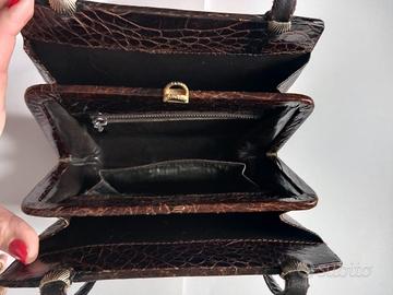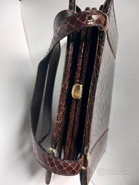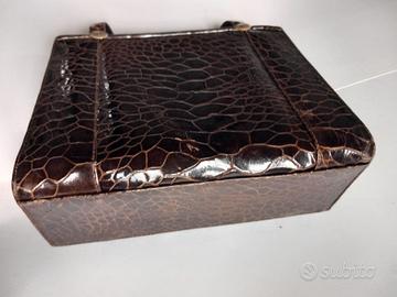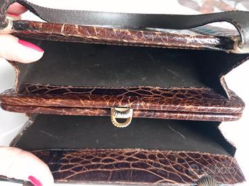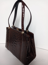 Borsa vintage in vera pelle laccata, color marrone. Interno in pelle. Dotata di due scomparti aperti e uno con chiusura a portafoglio, oltre a una tasca aperta e una con zip. Molto elegante e chic. Dimensioni: 20,5x16x9 cm