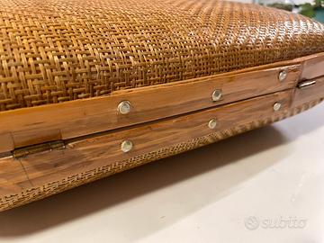 Borsa vintage rigida in vimini intrecciato con piccoli manici, chiusura, foderata internamente con tasca con cerniera, piccola ma molto capiente.