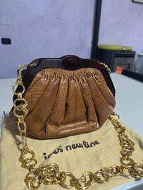 Vendo deliziosa borsa vintage firmata Ipes New Line, un vero gioiellino per amanti del genere. La borsa è una pochette rigida con chiusura a scatto (clasp) in stile retrò. Caratteristiche: Esterno in similpelle con pregiata lavorazione stampa pitonata sui toni del marrone/caramello. Bellissima cornice rigida superiore ed apertura effetto tartarugato (tortoise) lucido. Tracolla a catena dorata lavorata, molto luminosa ed elegante (removibile o nascondibile all'interno per portarla a mano come clutch). Interno foderato pulito con taschino laterale. Completa della sua dustbag originale "Ipes New Line". Condizioni: La borsa é in eccellente stato di conservazione, la catena è brillante e non presenta ossidazioni come si puó notare dalle foto. Ideale per cerimonie, matrimoni o per dare un tocco vintage chic a un outfit serale. Ipes New Line non è una marca "famosa" nel senso commerciale moderno (come Liu Jo o Balenciaga), ma è un marchio che si trova spesso nel mondo del vintage italiano. Chi cerca questo tipo di oggetto non cerca il brand per "mostrarlo", ma cerca la qualità costruttiva di una volta e l'unicità del pezzo.
