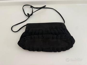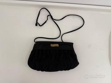 Realizzata in tessuto nero plissettato, con dettagli in velluto e placca metallica dorata firmata sul fronte. Interno logato con tessuto jacquard e logo ricamato. Tracolla sottile in corda.