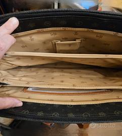 Elegante borsa vintage firmata Montecarlo di Filanti, realizzata in resistente canvas con inserti in vera pelle color cuoio e dettagli dorati. Interno foderato con logo, dotato di scomparti comodi per l’organizzazione quotidiana.Made in Italy.