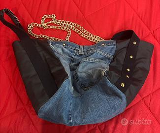 Bellissima borsa artgianale usata in vera pelle e Jeans Levis 501 molto bella cambiabile puo essere da passeggio con chiusura con le maniche altrimenti puo essere chiusa diversamente e portarla a tracolla con catene color oro . X qualsiasi chiarimento non esitate a contattarmi, guardate le altre mie inserzioni .