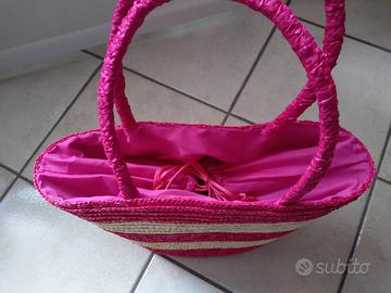 Borsa in paglia con fodera interna in tessuto e chiusura con cordoncino.