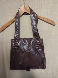 Borsa vintage in pelle marrone anni '70. Originale apertura a libro con cerniera laterale e due tasche interne con cerniera. Chiusura con bottoncino automatico. Misure, base 28 x altezza 25, lunghezza con manici 48 cm. Misura aperta 50 x 48 cm.