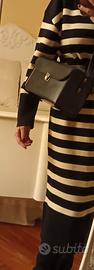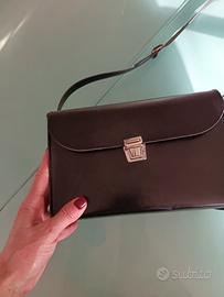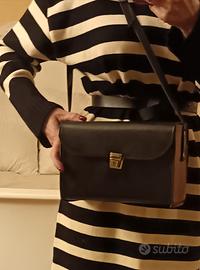 Borsa vintage da fotografo, in vera pelle nera, usata come borsa da donna, tracolla fissa regolabile con fibbia, qualche alone, interno senza tasche e scomparti
