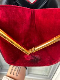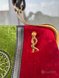 Splendida borsa a mano originale Roberta di Camerino, icona dell'eleganza Made in Italy. Realizzata nel celebre velluto veneziano tessuto a telaio nei toni del rosso rubino e verde bosco, con inserti in vera pelle nera.