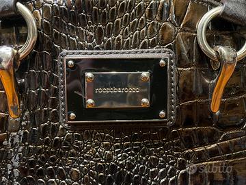 Borsa Rocco Barocco vintage a mano, effetto coccodrillo lucido color marrone scuro. Modello super particolare, fa subito outfit ed è perfetta sia con look street che più eleganti. Essendo vintage presenta qualche segno del tempo, ma è ancora utilizzabile senza problemi. Chiusura con zip funzionante, manici ok. Un pezzo unico, difficile da trovare, ideale se ti piacciono accessori vintage con carattere.