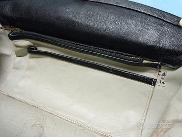 Tre tasche interne, di cui una con cerniera e una aperta su un lato (dove è presente anche un' etichetta relativa alla marca della borsa, che è stata tagliata), e un'altra tasca interna, con chiusura a susta, sul l'altro lato.
