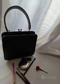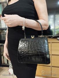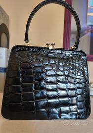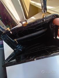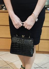 Borsa vintage pelle Elegante borsa vintage originale,in vera pelle nera lucida stampa cocco risalente agli anni ’50/’60, con classica chiusura a scatto. kiss look dorata manico rigido da mano e struttura rigida. Misure L.23 A. 28 ( con manico 31), P. 8. Stile retrò intramontabile Buone condizioni vintage, con normali segni del tempo ( vedi foto interno) che ne testimoniano l’autenticità. Perfetta per amanti del vintage oufit eleganti o retrò. Segni particolari: bellissima. Buone condizioni , con normali segni del tempo che ne testimoniano l’autenticità. Perfetta per:✔️ amanti del vintage✔️ outfit eleganti o retrò✔️ collezionisti