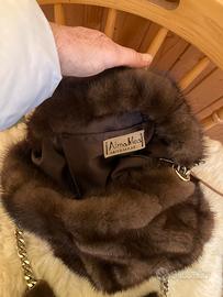 Birsa a secchiello in vero visone, fiderata e con chiusura a coulisse. Tracolla in metallo color ottone con salva spalla in visone. Interamente fatta a mano utilizzando pelliccia vintage.