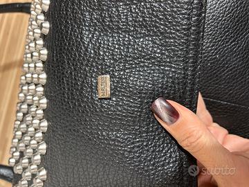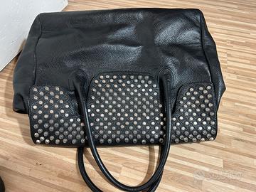 Borsa molto grande in vera pelle con patella ricoperta di borchie, creata artigianalmente in Italia dal brand Maltese. Lievissimi segni di usura visibili nelle ultime due foto.