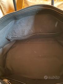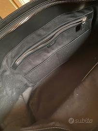 Pelle martellata nera e interno tela e dettagli in pelle.