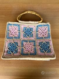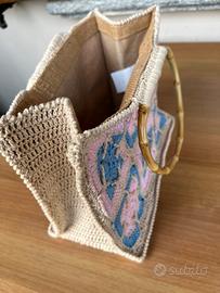 rivestita esternamente con motivi all'uncinetto in puro cotone e con antichi centrini fatti a mano, Con fodera interna di rasone (anche questa ritagliata e adattata a mano)