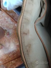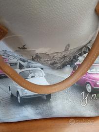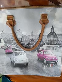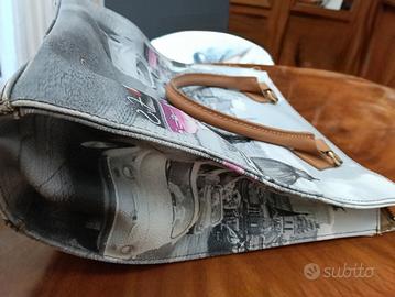 Un classico che non passa mai di moda che si può indossare con tutto.Utilizzata poche volte è di dimensioni 32×32x10cm. Di un colore brillante prevalentemente dalle tonalità grigio chiaro, scuro, bianco ha stampate delle 500di colore fucsia e bianche.Presenta delle piccole scoloriture nella fodera interna visibili solo se si apre la borsa.Tenuta in buono stato è dotata di due maniglie e chiusura con zip. Interno foderato e organizzato.