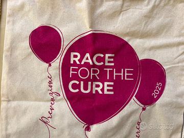Borsa, zaino a tracolla, in 100% cotone per la gara/passeggiata Race for the Cure, tenutasi a Roma l'11 maggio 2025. Color panna e rosa.