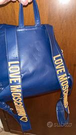 Borsa Zaino Love Moschino in ecopelle trapuntata, colore blu intenso con dettagli dorati. - Logo Love Moschino a forma di cuore sul davanti. - Tracolla regolabile e rimovibile con scritta LOVE MOSCHINO dorata. - Chiusura principale con zip. - Tasca esterna con zip. - Dettagli in metallo dorato.