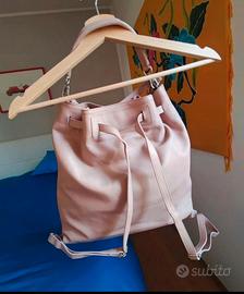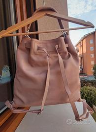 Zaino borsa in pelle colore Rosa antico. Nella prima foto, con il sole, si apprezza il colore reale. Chiusura con bottone. Doppia Taschina interna. Manico. Usato poco, condizioni ottime, nessun segno di usura come si vede dalle foto. Si può trasformare in una borsa a spalla, a tracolla o a mano sganciando dal moschettone i due passanti anteriori che nella foto si intrecciano tra loro.