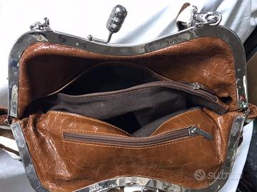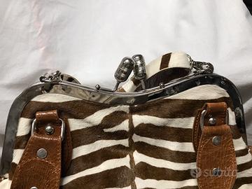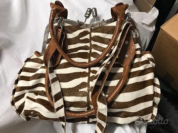 Borsa zebrato bianca e marrone con manici e tracolla. Chiusura a Borsellino retro. Due grandi scomparti divisi da una ampia tasca con cerniera, una cerniera piccola e due tasche. Spedizione a parte.