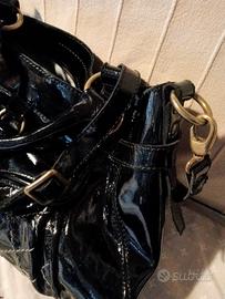 Borsa Zippo in vera pelle di vernice nera, in ottime condizioni, senza segni di usura, morbida e resistente, VERA PELLE di qualità. Accessori in ottone, perfetti, ben conservati. Fodera sana e pulita. Dimensioni 40x30cm circa e 10/15 di profondità. Con tracolla regolabile.