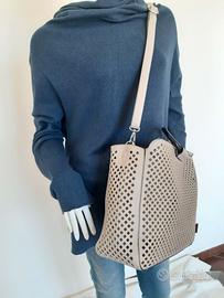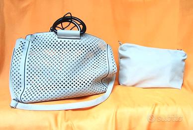 Borsa tracolla /spalla /a mano grigio chiaro , traforata a quadretti , in similpelle ; chiusura con zip argentata . dimensioni medio/grande , con borsetta con ganci all’interno estraibile e utilizzabile separatamente .
