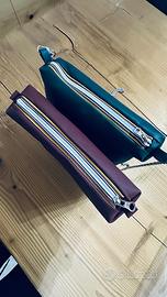 Borsa di produzione artigianale da laboratorio di pelletteria, in vera pella pieno fiore. Fodera interna in microfibra. Tracolla in acciaio. Misura cm 25 x 20, spessore 5 cm.