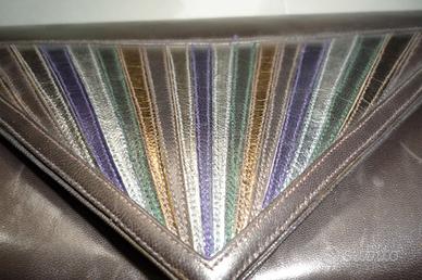 4 foto: Pochette *Malto* Padova, camoscio naturale, velluto goffrato, seta. All'interno su fodera in seta goffrata, una tasca con cerniera. 29 x 22,5 x 7 cm. Si chiude con una grande cerniera. Nuovo. Prezzo 27 euro;