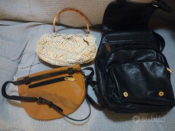 lotto 3 borse donna: borsa zaino nera, borsetta marone a tracolla, borsetta con pizzo bianca con manici.