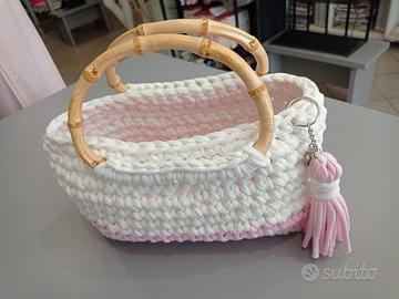 Borse realizzate all'uncinetto in con fettuccia in cotone riciclato e manico in bamboo. Belle pratiche e comode.