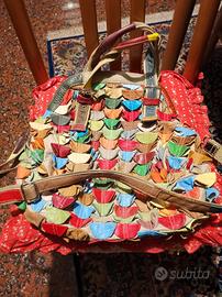 BORSA IN STOFFA con applicazioni in pelle multicolor. 2 manici più tracolla. Chiusura con cerniera. 2 tasche interne più 1 con cerniera. Misura h 40x35.......€ 40