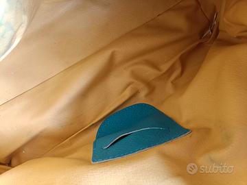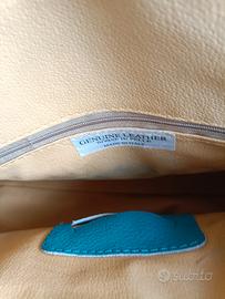 Borsa modello Kelly colore turchese in vera pelle usata poco e in ottime condizioni, misure base cm.14x38, larga cm.38, h. cm.26, doppi manici, tracolla removibile, scomparto interno e portacellulare, vendo a 15 euro.