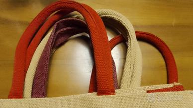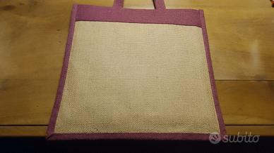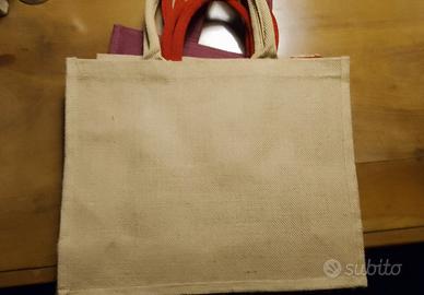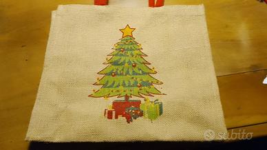 Quattro borse in juta per regali natalizi oppure come sacche da mare dopo averle eventualmente decorate con passamanerie varie. la prima con dipinto un pick up con l'albero di Natale misura 36 x 33 cm larga 12 cm, manici e bordi laterali rossi. la seconda ha un albero di Natale misura 35,5 x 30,5 cm larga 12,5 cm i bordi laterali sono rossi. La terza non ha alcun disegno misura 41 x 32,5 cm ed è larga 15 cm. lLa quarta è profilata di colore amaranto 35,5x35 cm larga 10 cm, ha al suo interno un separatore estraibile con quattro scompartimenti sempre in juta dove si possono posizionare bottiglie per tenerle bene in piedi. Vendibili anche separatamente.