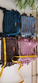 Borse uncinetto con frange laterali e chiusura a calamita cucita al suo interno. Disponibili in rosa antico, marrone, grigio e blu petrolio.