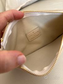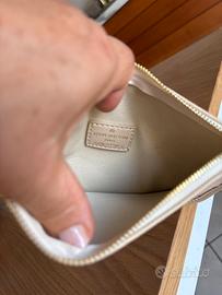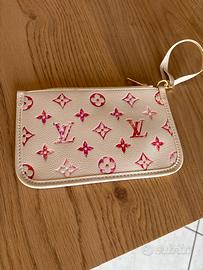Vendo borsellino Louis Vuitton, beige chiaro, con loghi rossi, chiusura a cerniera e laccio laterale per indossarlo come borsetta. Lungo 21 cm alto 14, come nuovo.
