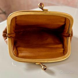 Si tratta di un borsellino in pelle color cuoio con una caratteristica chiusura a scatto (nota anche come "kiss-lock" o "a bocca di lupo") in metallo dorato. La chiusura presenta due piccole sfere decorative, una rosa e una nera, che si incastrano per chiudere la borsa.