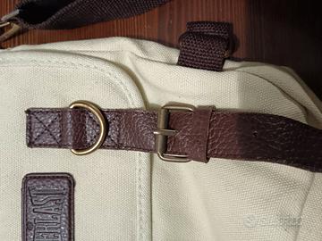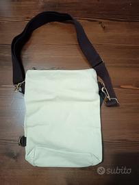 Borsello in tela, colore bianco crema e marrone, molto spazioso, mai usato Misure: Larghezza 22cm Altezza 28 cm Profondità 10 cm