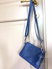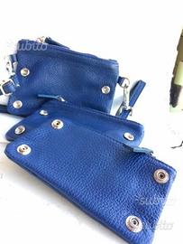 Borsello in pelle a tracolla, di colore blu chiaro, originale Jacky Celine, composto da tre unità sovrapposte unite da bottoni penumatici, dimensioni 17x12x4 cm. Lunghezza tracolla 67 cm, cmq regolabile nell'allungo. Condizioni perfette, pari al nuovo.