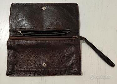 In vera pelle, colore marrone Pochette con cinturino da polso e passamano Molto pratico da usare quotidianamente, in qualsiasi circostanza Di ottima fattura con cuciture ben rifinite Misura: 25 x 13 x 3 cm