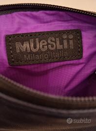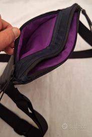 Blu molto scuro con interno a contrasto viola/fuxia. Misura 23x29 ed è spesso circa 3 cm. Ha un vano principale e una tasca frontale con cerniera.