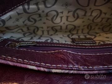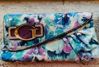 Borsello della Guess, colori azzurro-viola-bianco con inserti in pelle color viola e brillantini. La stoffa esternamente e internamente è integra.
