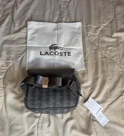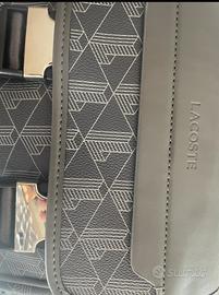 Borsellino uomo Lacoste, mai utilizzato, completo di cartellino e sacchetto protettivo (dust bag). Design moderno con stampa monogram tono su tono e logo iconico frontale. Compatto ma capiente, ideale per portare essenziali quotidiani (telefono, portafoglio, chiavi). • Condizione: nuovo con etichette • Colore: grigio/antracite • Tracolla regolabile • Chiusura con patta e dettagli a fibbia • Completo di dust bag