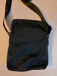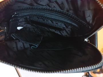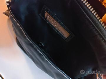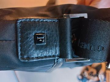 Come da foto borsello a tracolla marca Ferrè Milano in misto materiale sintetico e pelle, ha due tasce una esterna euna interna con cerniera più dei piccoli scomparti all'interno larghezza 18 cm altezza 22 cm spessore 5 cm ,