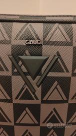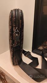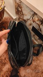 Il borsello ha un design elegante e moderno, con una superficie caratterizzata da un motivo a triangoli neri su sfondo grigio. È realizzato in un materiale resistente, ideale per l'uso quotidiano. L'accessorio presenta una tracolla regolabile, che offre comodità e versatilità. La chiusura potrebbe essere zip o con una patta, aggiungendo ulteriore funzionalità al design. Questo tipo di borsello è perfetto per trasportare oggetti essenziali come un tablet, documenti o piccoli accessori.