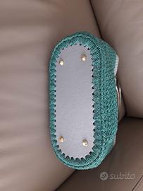 Borsetta a mano, realizzata a uncinetto, color verde acqua lurex e argento lurex, con chiusura a calamita, fondo rigido grigio con piedini, manici rotondi in metallo color argento con diam. 13,5 cm, dimensioni: l. min 27 cm, max 29 cm; larghezza 10,5 cm, h 21 cm, h totale con manici 28 cm