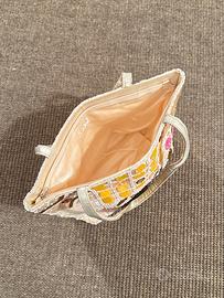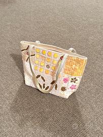 - Altre informazioni: La borsa presenta diverse sezioni decorate. Una parte con paillettes cangianti, una con perline intrecciate a motivo floreale e una sezione centrale con applicazioni circolari gialle a rilievo. Doppi manici sottili interamente ricoperti di perline avorio. Chiusura sicura.