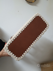 Borsa fatta interamente a mano, all'uncinetto, in cordino italiano in polipropilene e in vera pelle i manici, il fondo e la chiusura a scatto. Le parti in pelle sono prodotte artigianalmente da una ditta italiana. Rifinita e foderata a mano in prezioso tessuto di seta, è provvista di due tacchini interni.