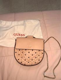 Vendo questa elegante borsa a tracolla rosa Guess in perfette condizioni (usata pochissimo). Il design è femminile e moderno: la parte frontale presenta una lavorazione trapuntata con borchiette metalliche, mentre la patta superiore è liscia con logo Guess.