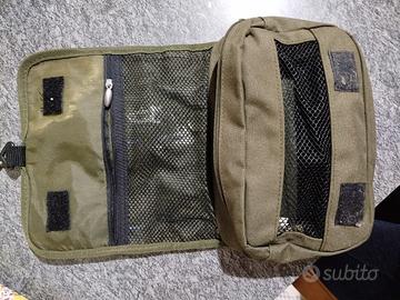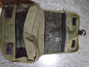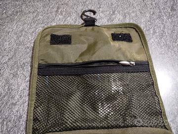 con manico e gancio per appenderla, tasche interne con cerniera, utile portaoggetti, presenta una lieve macchia all interno.